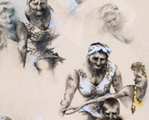 Larger-Than-Life. Works of nude figure art take on forceful poses as they wxplode across eight foot (and larger) canvases of paper, gesso and gold leaf infused abstraction and erotica.
